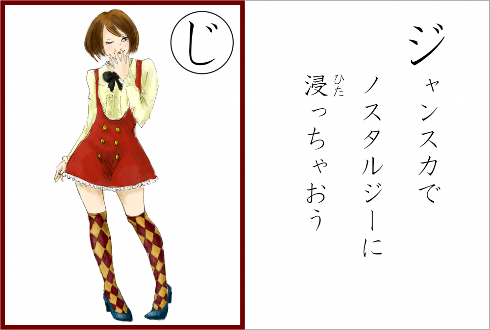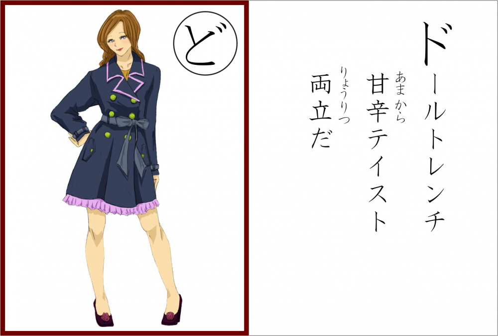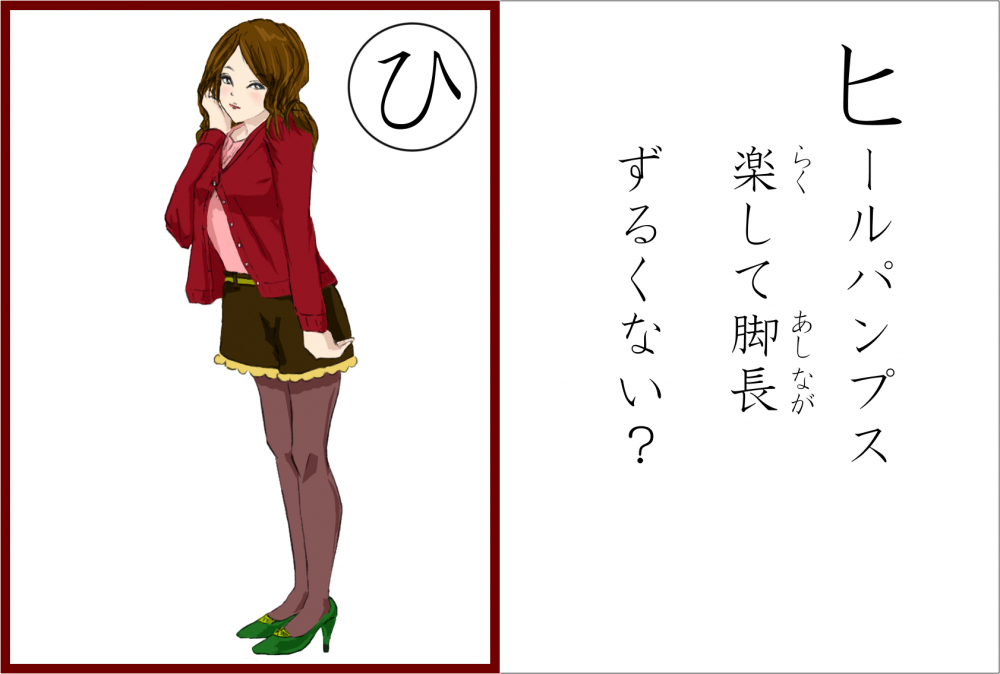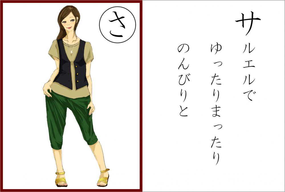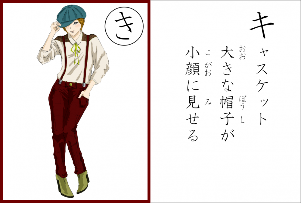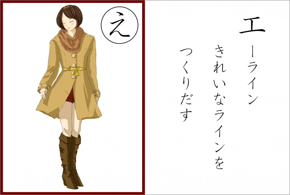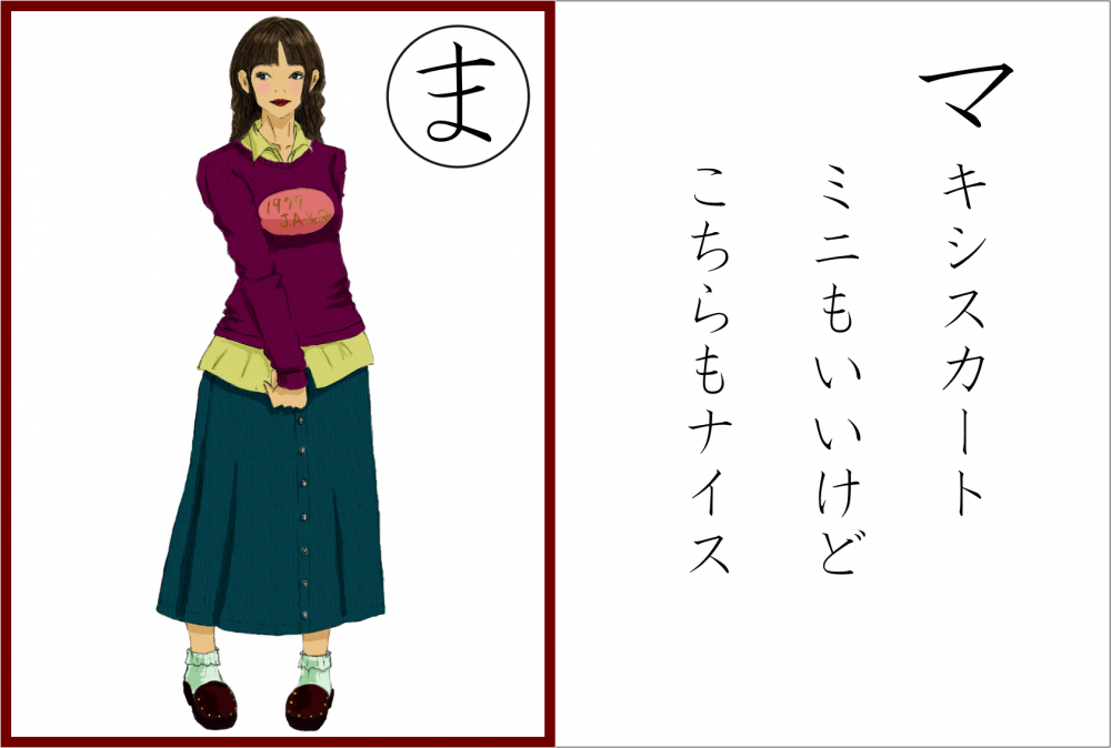 ファッションイラストで、かるたをつくっています。作者考案オリジナルファッションを描いた「オリジナルファッション編」と、街で見かけた素敵な女性を、記憶のみを頼りに描いた「いただきファッション編」の二つがございます。絵札、字札もろとも楽しんでいただけたら幸いです。