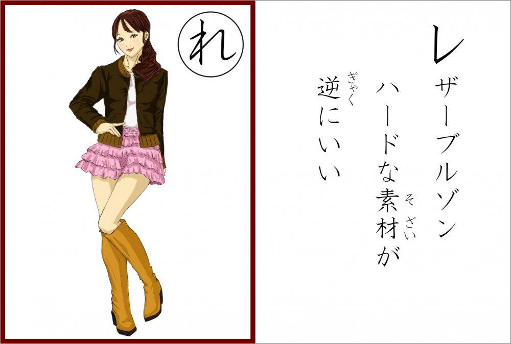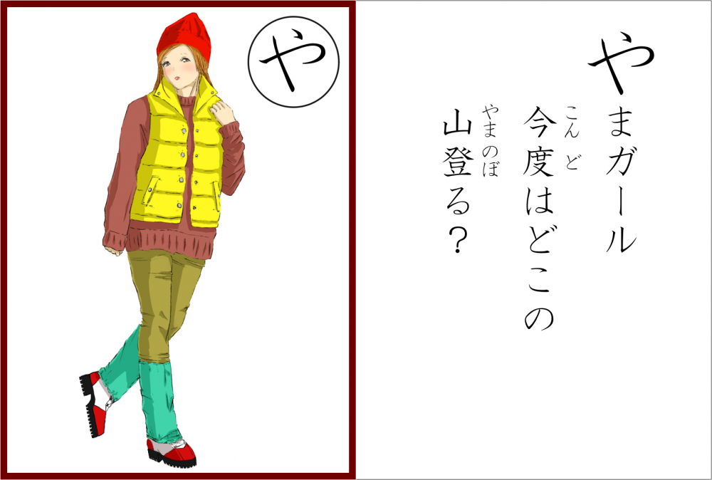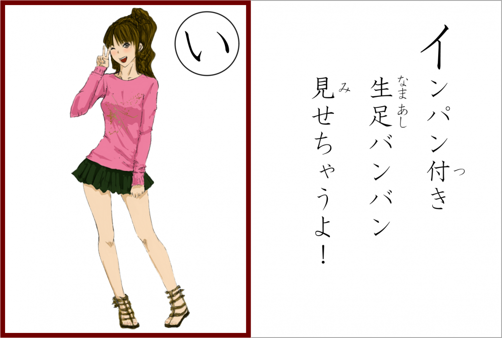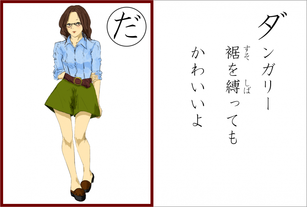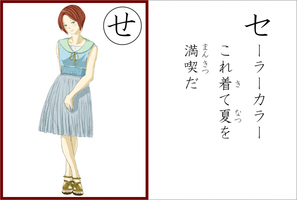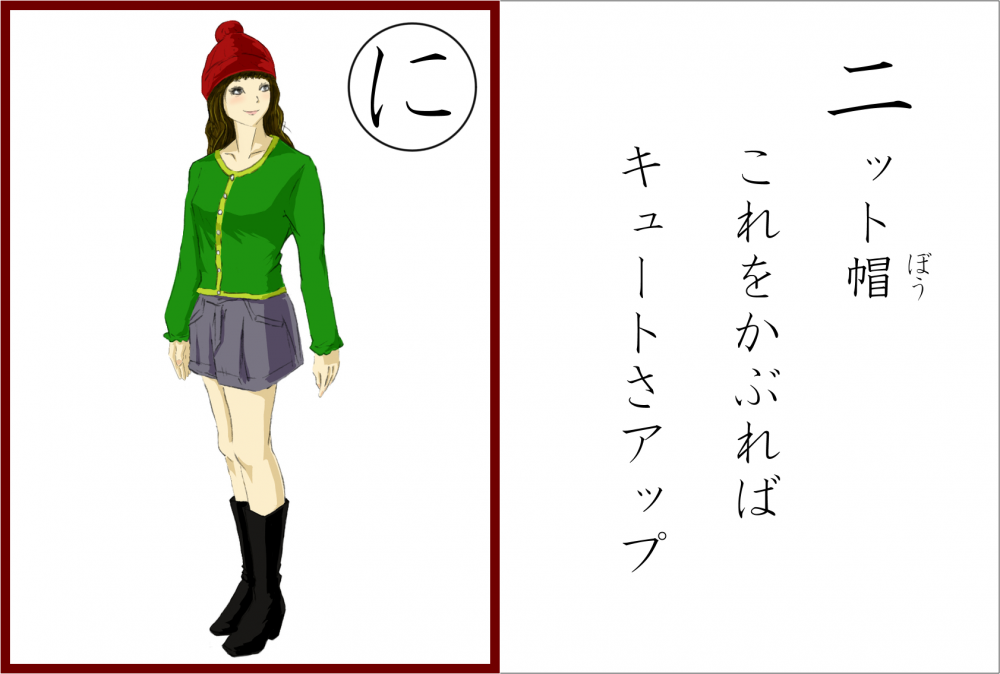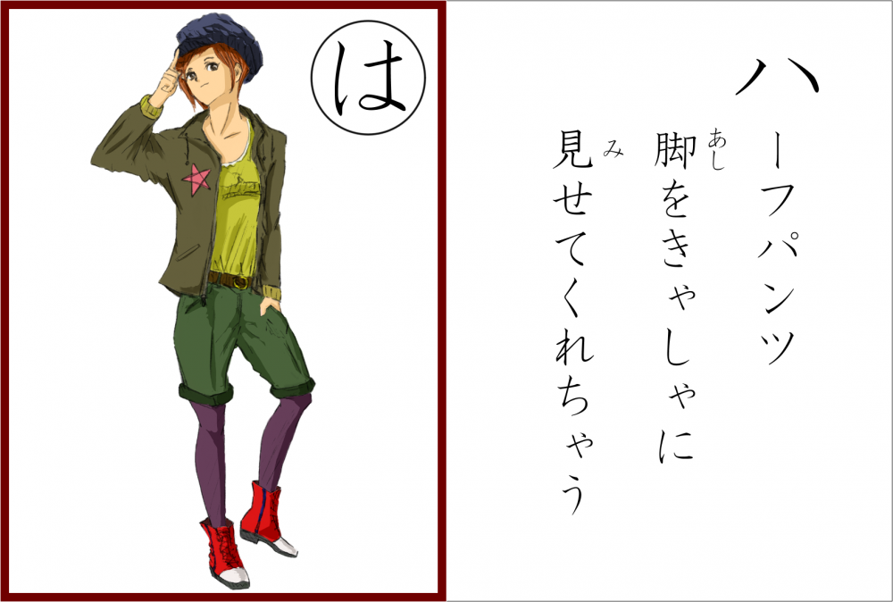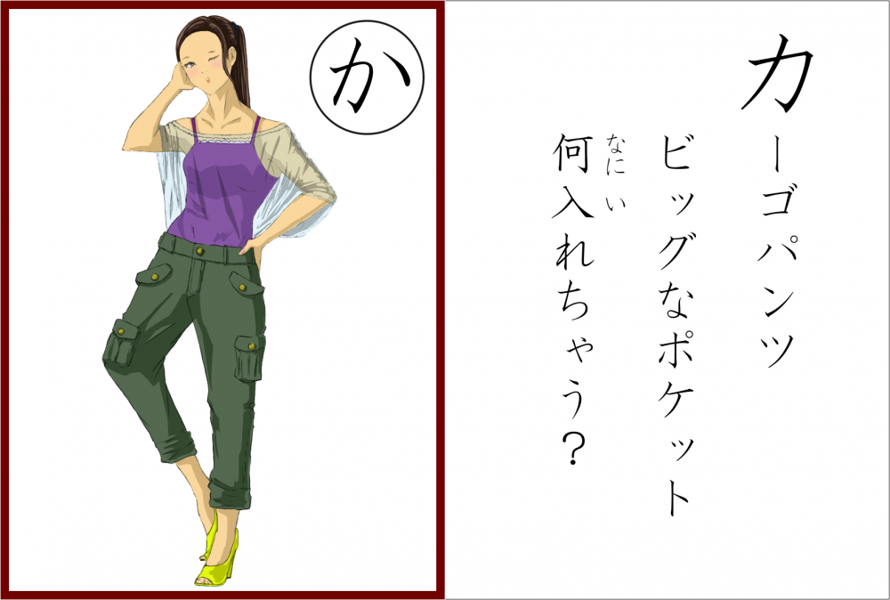 ファッションイラストで、かるたをつくっています。作者考案オリジナルファッションを描いた「オリジナルファッション編」と、街で見かけた素敵な女性を、記憶のみを頼りに描いた「いただきファッション編」の二つがございます。絵札、字札もろとも楽しんでいただけたら幸いです。